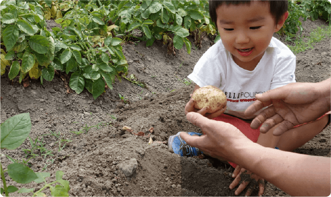 畑で野菜の栽培、収穫を行っています。土いじりで手先の器用さや食育の体験を提供します。